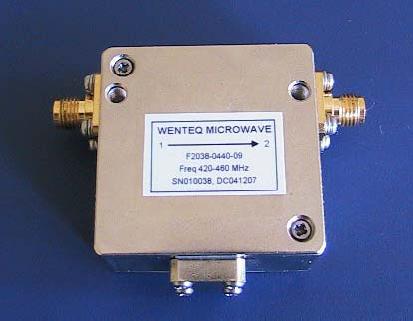 Wenteq Microwave offers Coaxial RF Isolators Model F2038 with Frequency range: 420~820MHz, bandwidth up to 10%. Specifications of this Coaxial RF Isolators Model F2038 include SMA connectorized configuration, Power handling +50 Watts forward, Operating temperature -30~+60°C and Customer specify center frequency and bandwidth.